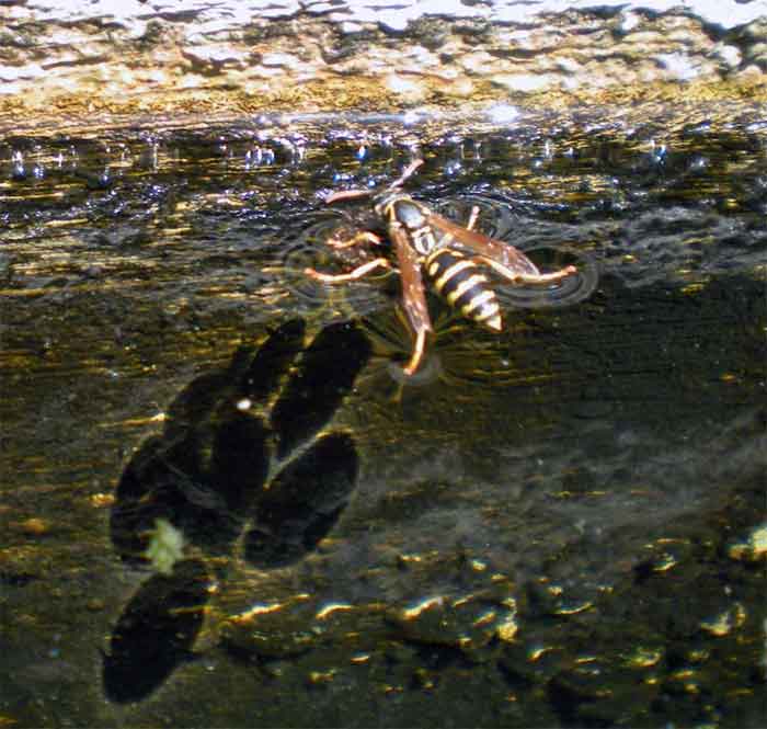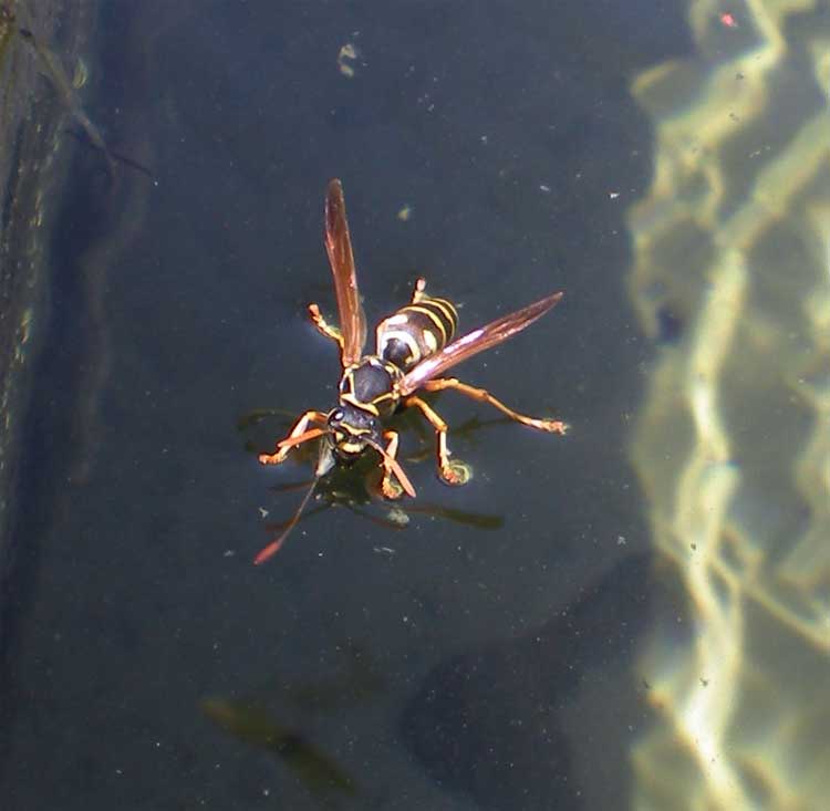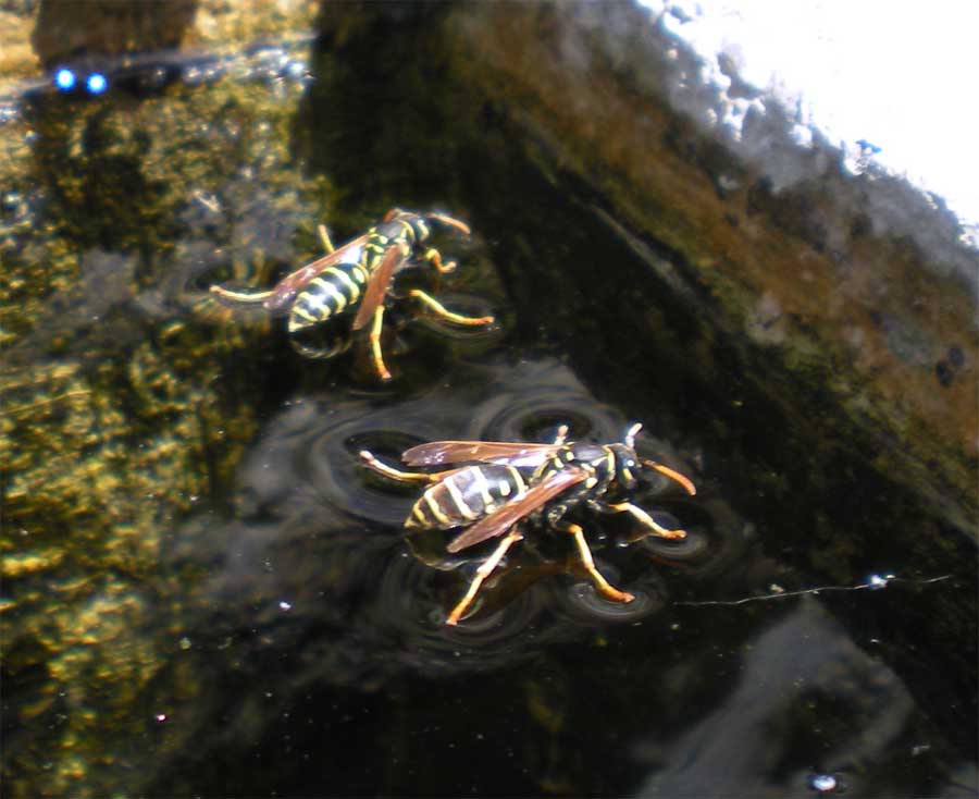 En las imágenes se puede observar bien las patitas de las avispas sobre el agua. Alrededor de sus patitas el agua se dobla hacia abajo debido al peso de la avispa. Y se dobla sin que la pata penetre en el agua. Esto es debido a la tensión superficial del agua, a la resistencia que ofrece el agua a ser penetrada. Es por ello que si echamos agua sobre una superficie esta quedará distribuida en gotas. Esta tensión superficial es aprovechada por insectos acuáticos como los zapateros.
