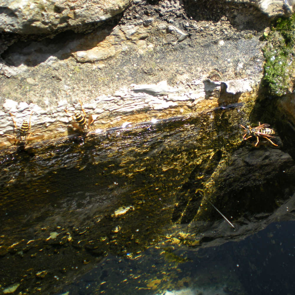 Las imágenes que acompañan esta entrada fueron tomadas ayer sábado por la mañana en una fuente de un pueblecito de los Pirineos. Pasé el fin de semana en Planoles, en la Vall de Ribes, Girona. Había un montón de avispas papeleras revoloteando alrededor de una fuente. Me paré a tomar algunas fotografías. He visto en muchas ocasiones acercarse avispas al agua para beber. Lo que nunca me había parado a ver es que además de beber pegadas a la pared de una fuente, son capaces de posarse sobre el agua. Con la misma facilidad con la que se posan, alzan el vuelo majestuosamente.