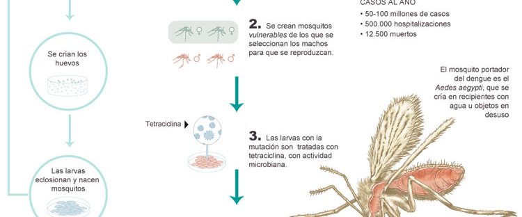 El proyecto es sencillo de explicar, aunque la tecnología con la que se lleva a cabo no lo es tanto. Se trata de modificar genéticamente machos de Aedes aegypti para que tengan una descendencia no viable. De esta manera, la hembra se aparea con estos machos modificados, pone los huevos y tras el periodo de incubación nace una larva que muere. En la biofábrica se inyecta en cada uno de los huevos ADN con un gen letal y luego se separan los machos de las hembras. Este proceso se puede entender mejor con la infografía publicada por El País (figura 1).