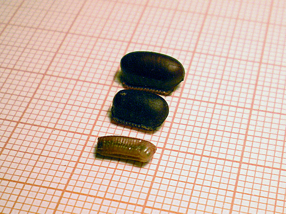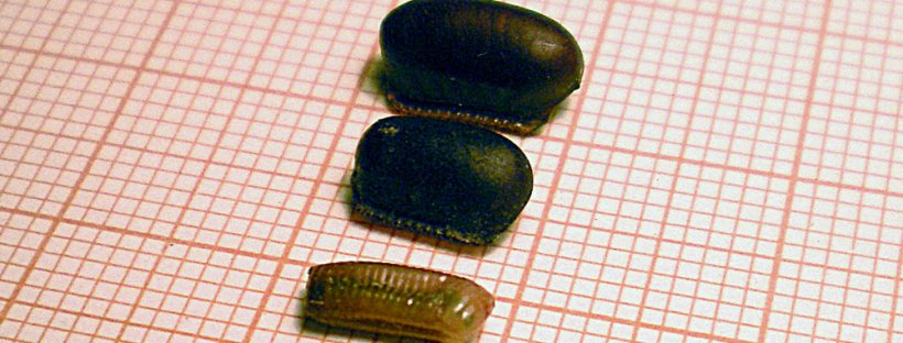 En este posteo haré una comparativa entre las ootecas de las tres especies de cucaracha que podemos encontrar en Barcelona. La foto no tiene unos colores correctos (además está hecha a contraluz), pero bien nos vale. El papel milimetrado sobre el que están puestas las ootecas nos permite hacernos una idea aproximada de su tamaño. De arriba a abajo, tenemos una ooteca de cucaracha negra (Blatta orientalis), una de cucaracha americana (Periplaneta americana) y una de cucaracha alemana (Blattella germanica), también conocida como de cocina. Una cucaracha americana adulta (de 34-53 milímetros) es de mayor tamaño que una oriental (de 20 a 35 milímetros), pero las ootecas de esta última suelen ser mayores y algunas soprepasan el centímetro de largo.