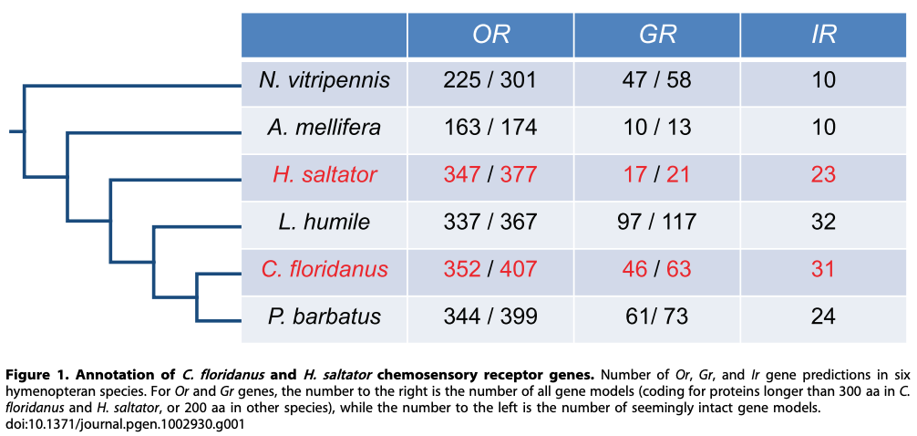 El estudio examina los receptores quimosensoriales de cuatro especies: Harpegnathos saltator, Linepithema humile, Camponotus floridanus y Pogonomyrmex barbatus. Esta clase de receptores en las hormigas pueden ser receptores de olores (OR), receptores gustativos (GR) y receptores de glutamato ionotrópico o ionotrópicos (IR), de decubrimiento reciente, que sirven para identificar compuestos tóxicos y venenosos. En la figura número 2, se pueden ver el número de genes implicados para cada tipo de receptor en las especies de hormigas, pero también en abejas y moscas. En el caso de las hormigas, hay grandes diferencias entre las cuatro especies, lo cual probablemente refleja las adaptaciones ecológicas y necesidades sociales de cada una.