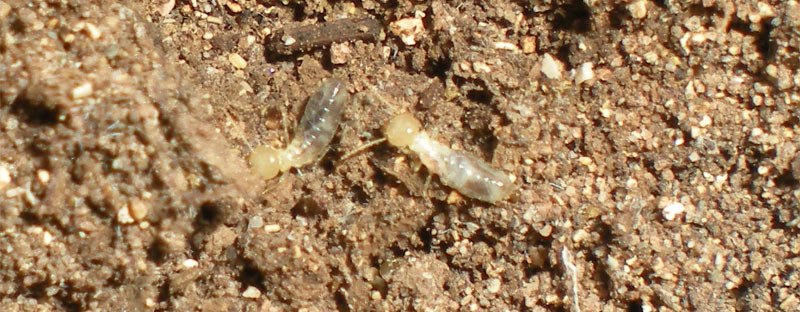 En la imagen número 2 se puede ver las maderas atacadas por termitas. Y al poco ya las vi cómo asomaban la cabeza. Retiré las maderas y empecé a peinar el suelo. Vi algunas galerías que se adentraban al suelo. En la imagen número 3 se puede ver dos termitas obreras sobre la arena. Me llevé algunas termitas como pude para poderlas observar de regreso con la lupa binocular.