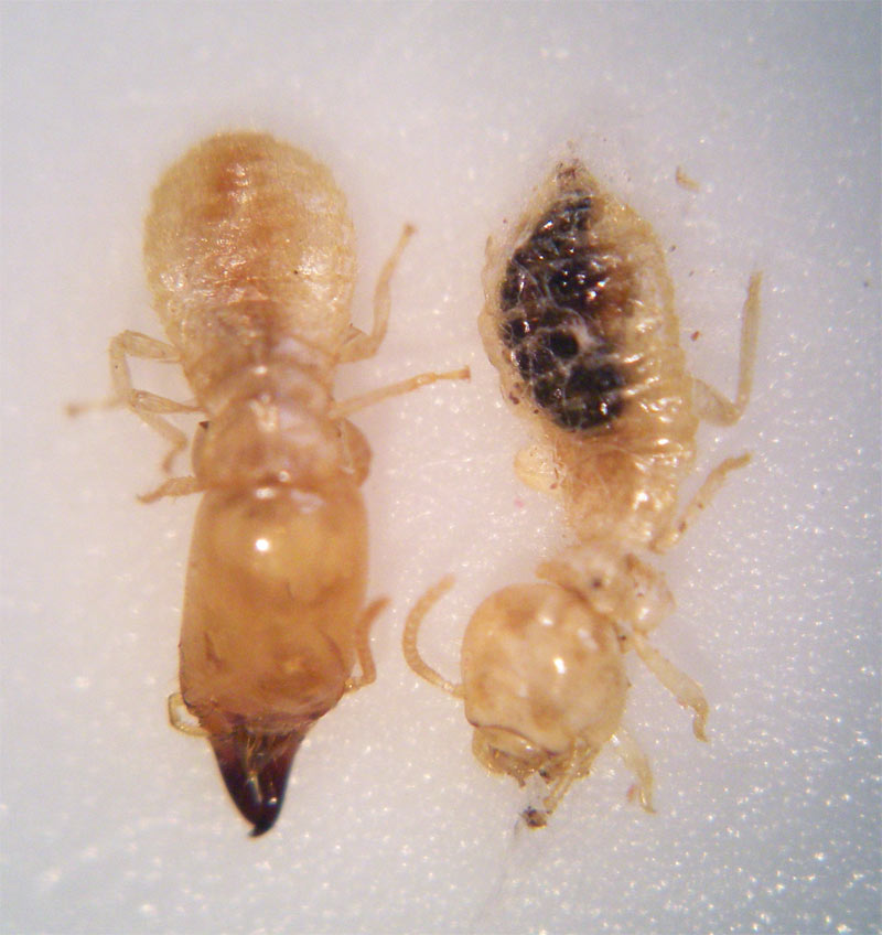 En la imagen número 4 se puede ver una termita soldado y una obrera a través de la lupa binocular. No se aprecian mucho los detalles, porque de momento no puedo sacar fotos más nítidas, pero por lo menos se pueden ver la mandíbulas de la termita soldado. Además de unas mandíbulas mayores, tiene una cabeza mayor. Según los manuales, en Menorca tenemos termitas de la especie Reticulitermes banyulensis. Esta especie también está presente en la Península Ibérica ocupando la parte este desde los Pirineos hasta Murcia aproximadamente. En el resto de la península, tenemos otra especie de aspecto y costumbres parecidas llamada Reticulitermes grassei. Diferenciar ambas especies es muy difícil. Cosa de expertos. Pero a nivel de tratamiento, se tratan igual.