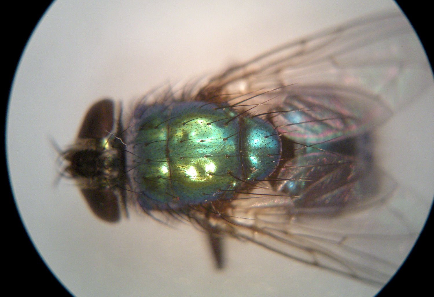 Fig 3. Imagen dorsal de Lucilia a través de la lupa binocular./ C. Pradera 09-2012.