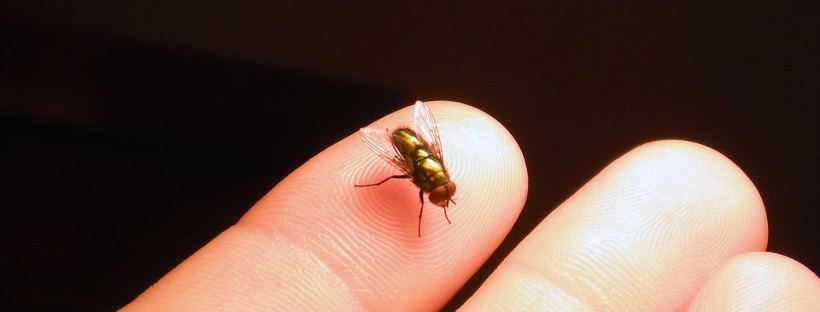 Fig 1. Mosca verde Lucilia sobre mi dedo índice./ C. Pradera 09-2012