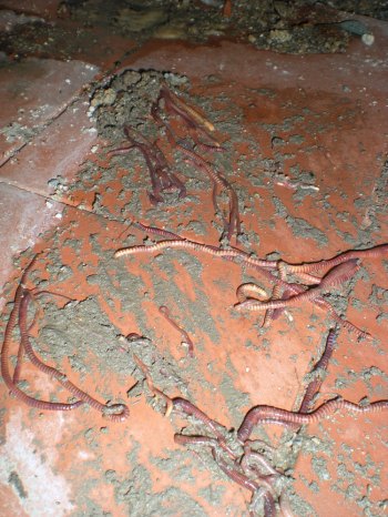 En mi último cliente de hoy me he encontrado con una sorpresa. Me he encontrado con un montón de lombrices. He entrado por la puerta del cliente a las 19:00 horas. Estaba cansado de trabajar todo el día desde antes de las 8 de la mañana. El cliente está en la calle Aragón, cerca del centro de Barcelona. Pensaba que lo único interesante que vería serían cucarachas americanas y el rastro de alguna rata ocasional. Se trata de un bar de copas donde sirven algo de comida. En la cocina, debajo de un fregadero he visto un cubo de fregar lleno de agua hasta arriba. Y el agua estaba muy sucia. He pensado que debía mover el cubo por si acaso debajo había cucarachas. Y cuando lo he movido, ¿cuál ha sido mi sorpresa? Pues me he encontrado con un montón de lombrices. Me he apresurado a coger la cámara de fotos de bolsillo. Y cuando he tomado unas cuantas fotos, he recogido unas cuantas lombrices para averiguar la especie. Es cierto que en más de una cocina me he encontrado lombrices, pero jamás tal cantidad. A un palmo del cubo, había un agujero en la pared. En el agujero había tierra. Quizás por allí llegaron.