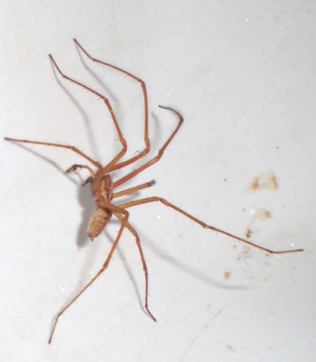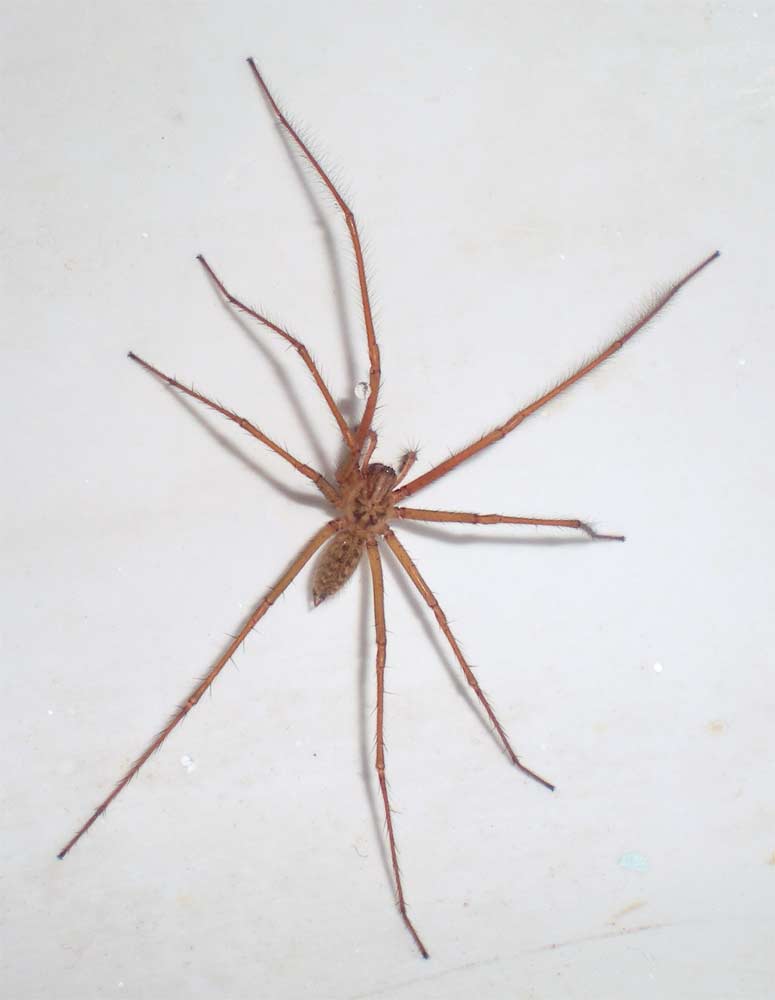 Ayer por fin encontré un buen ejemplar de la araña doméstica, (Tegenaria atrica). Estaba realizando un servicio de desratización en una casa de Vallvidriera (Barcelona). Al finalizar el tratamiento, me fui a lavar las manos y me topé con ella en el lavamanos. Había caído y no podía salir. La tegenaria no puede trepar por superficies lisas. Le hice una cuantas fotos y luego la saqué. Se trata de una de las arañas más comunes que podemos encontrar en zonas habitadas. De hecho, el nombre de tegenaria deriva de un vocablo griego que significa ‘tejado’, lo que hace referencia al hecho de convivir con el hombre bajo el mismo techo.
