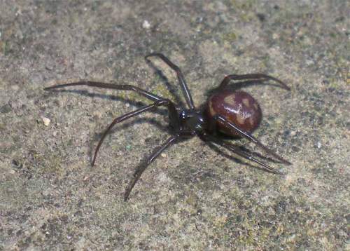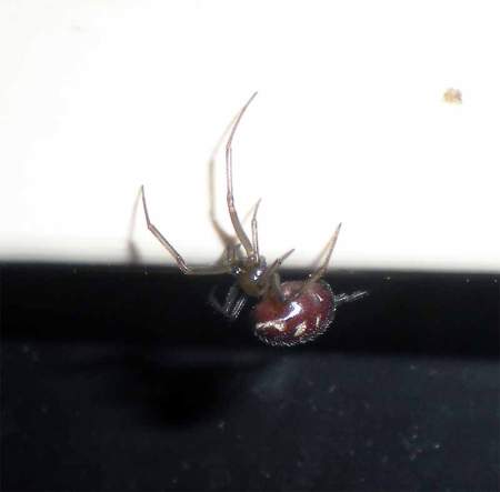 Por cierto, hace muchos años ví en la ducha una araña que parecía una steatoda pero era completamente negra y con una pequeña manchita blanca en forma de triángulo, en el opistomosa, por la parte de atrás ¿sabes cual podría ser?.