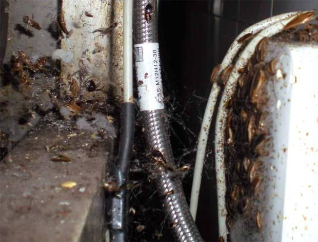 Fig 4. Steatoda grossa en la parte superior derecha de la imagen. Está junto a un anidamiento de cucaracha germánica de la cual se alimenta./ C. Pradera 09-2012