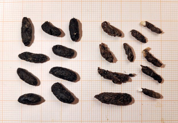 Fig 1. Excrementos de una rata de alcantarilla, a la izquierda, y de de salamanquesa, a la derecha./ C. Pradera 10-2019