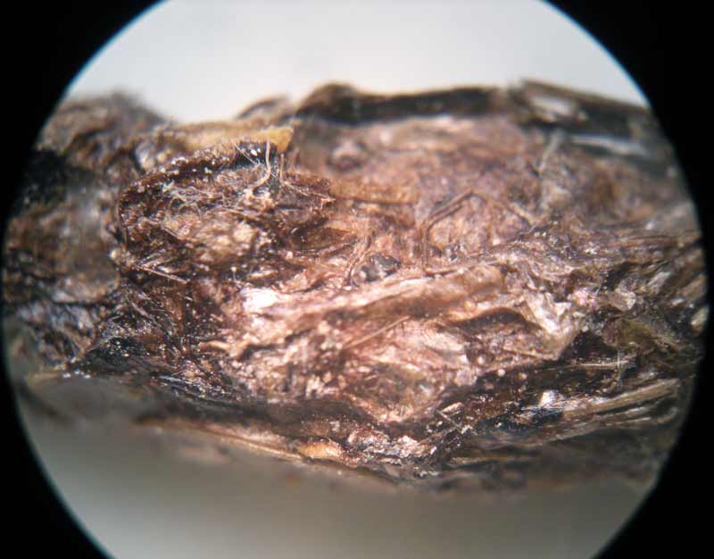 En cambio, los excrementos de la derecha son menos oscuros y tienen un aspecto rugoso y poco compacto. Son más ligeros. Un detalle importante es que en uno de los extremos tiene una parte blanca. Aunque no siempre encontramos el excremento con esta parte blanca, ya que suele desprenderse cuando cae des de cierta altura. Hay que remarcar que, si se presiona con el dedo un excremento de salamanquesa, se deshace quedando reducido a pequeñas partes. Este hecho es diagnóstico y es lo que permite saber si el excremento es de rata o de salamanquesa. Si se recogen estas pequeñas partes y se miran a través de una lupa binocular, veremos que se trata de restos de insectos que han sido comidos, pero que no han sido digeridos. Son restos de la cutícula de insectos. En las imágenes 2 y 3, se puede ver un excremento de salamanquesa a través de la lupa binocular.