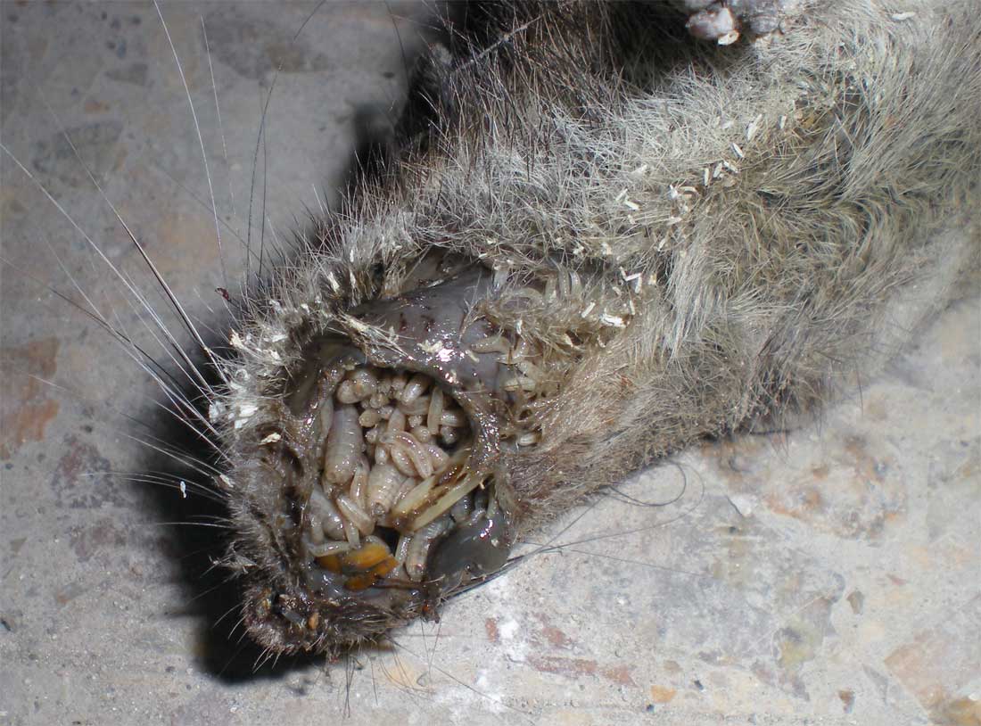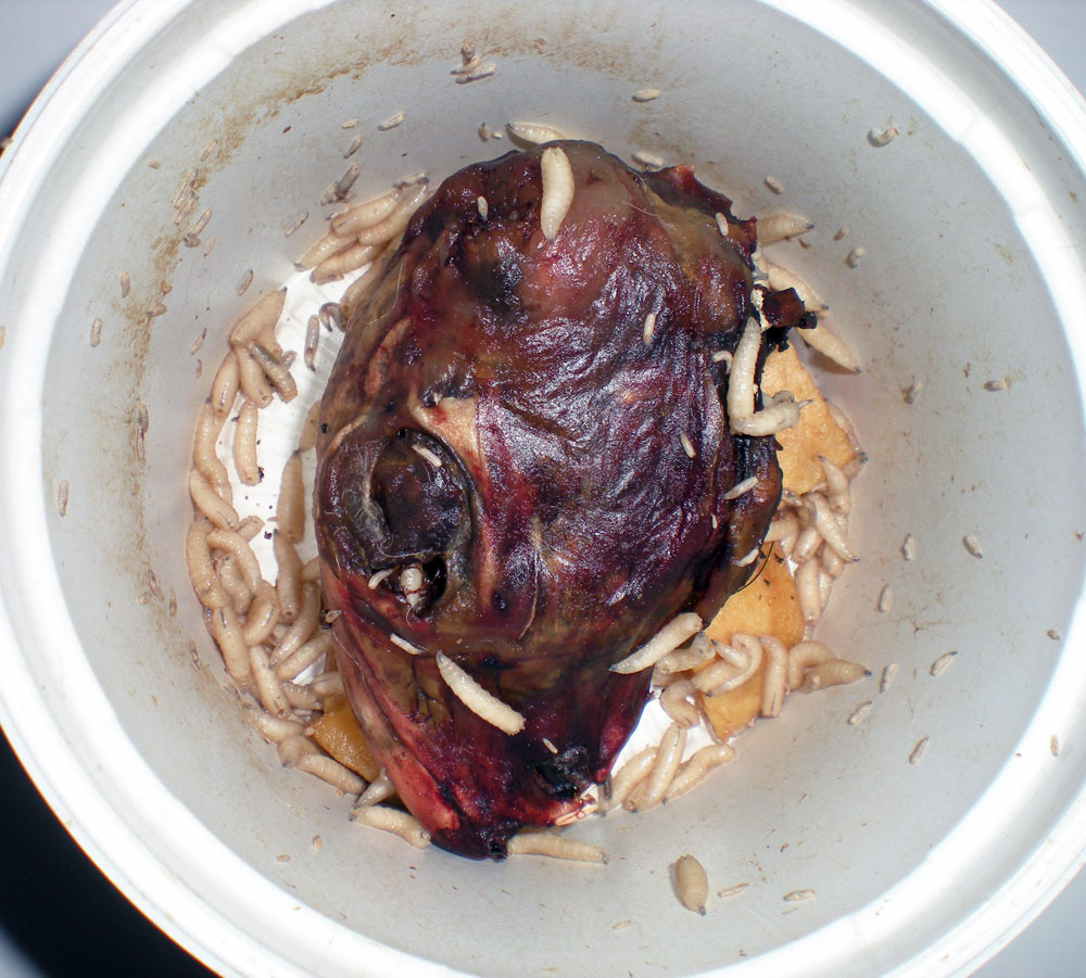 Fig 4. Queda poca carne en la cabeza por comer y las larvas empiezan a salir. Algunas de estas están maduras como para pupar. Otras no podrán llegar a ser pupas./ C. Pradera 11-2012