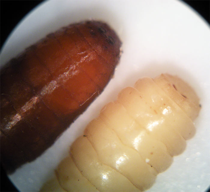 Fig 6. Imagen de una pupa y de una larva a punto de pupar, vistas a través de la lupa binocular./ C. Pradera 11-2012