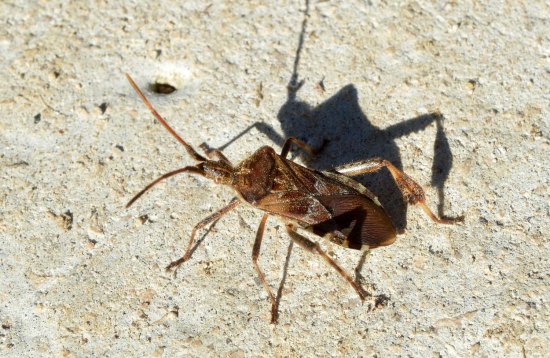 Hoy me he encontrado con una escena un poco rara. Un cliente tenía las paredes de la casa llenas de ejemplares de un insecto que no conocía. El cliente estaba un poco preocupado porque hacía ya una semana que cada día se encontraba con estos insectos por todas partes. La casa está en el campo rodeada de un bosque de pinos. Cuando me he acercado para observar al insecto he visto que se trataba de una chinche que no había visto antes. Así que he recogido unas cuantas y las he metido en un frasco. Al llegar a casa he recurrido a libros y no aparecía. Luego he recurrido a internet y navegando he dado con el nombre. Se llama chinche de las piñas y el nombre científico es Leptoglossus occidentalis. Y lo que he leído de esta no me gusta mucho. Aunque fea no es.