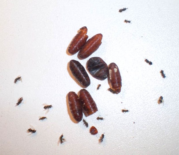 Fig 1. Avispas parásitas muertas junto a pupas de moscarda azul (Calliphora)./ Desinsectador 11-2012