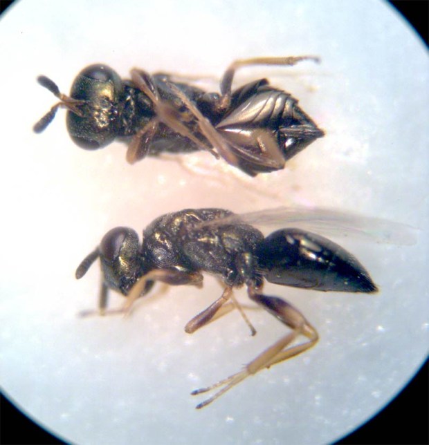 Identificar una avispa tan diminuta me parece una tarea difícil. Solo diré que lo más seguro es que se trate de una especie de himenóptero perteneciente a la superfamilia Chalcidoidea. No es decir mucho, pero algo es teniendo en cuenta que bajo el paraguas de este nombre hay centenares de especies. Las avispas de esta superfamilia son parasitoides de otros insectos. En la web del Natural History Museum de Londres existe una base de datos muy interesante con imágenes de especies de calcídidos: Universal Chalcidoidea Database. Es una base de datos con más de 400 registros. En general, los calcídidos son parásitos que nos benefician, ya que parasitan insectos que, si se multiplican mucho, pueden ser perjudiciales. En la imagen número 2 se pueden ver un par de ejemplares de las avispas que parasitaron las pupas de moscarda. No es una imagen muy nítida, pero permite hacerse una idea de su aspecto.