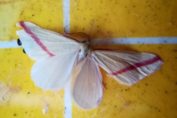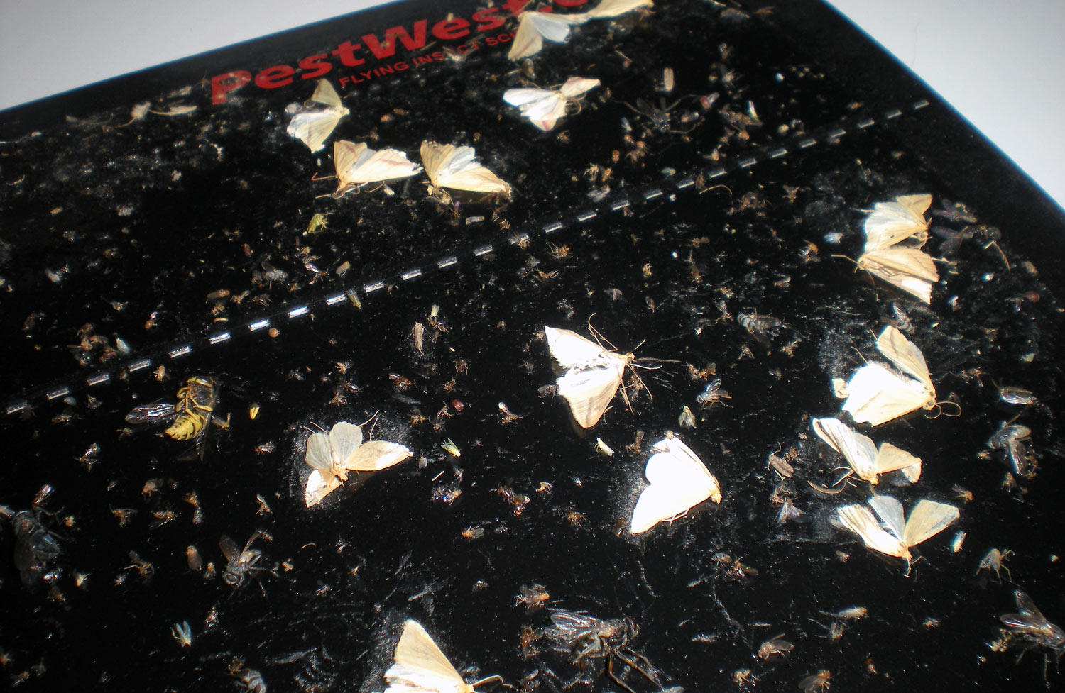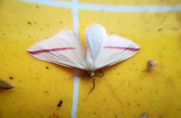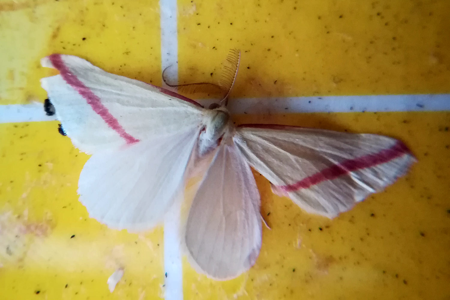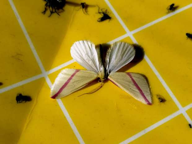 Fig 5. Mariposa Rhodometra sacraria en una lámina adhesiva en el puerto de Barcelona./ C. Pradera 09-2019