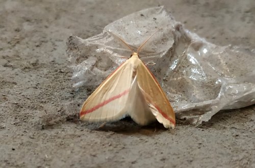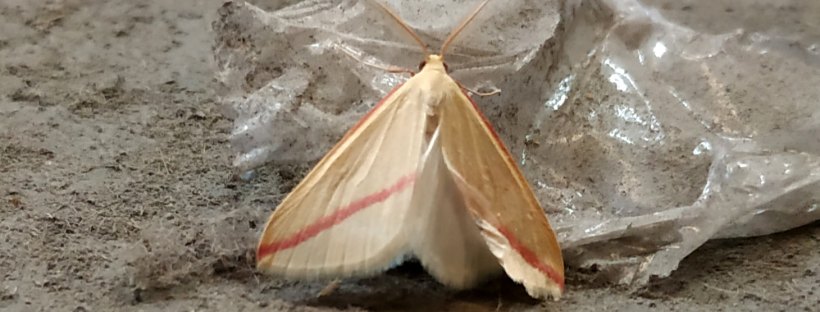 Dedico esta entrada al lepidóptero Rhodometra sacraria de la familia de los geométridos. No es fácil la determinación de especies en esta extensa familia. Valga como prueba el que yo he confundido durante tiempo a Rhodometra sacraria con Aspitates gilvaria. Ambas especies tienen las alas anteriores de color claro y están surcadas por una franja diagonal. Además, tienen un tamaño similar con una envergadura alar para la primera especie de 22-28 mm frente a 25-30 mm de la segunda. Ahora bien, si nos fijamos bien en una R. sacraria, podremos distinguirlas. La forma típica de esta especie es el ala delantera de color crema con una franja roja y con una línea roja en el borde delantero (figura 2).