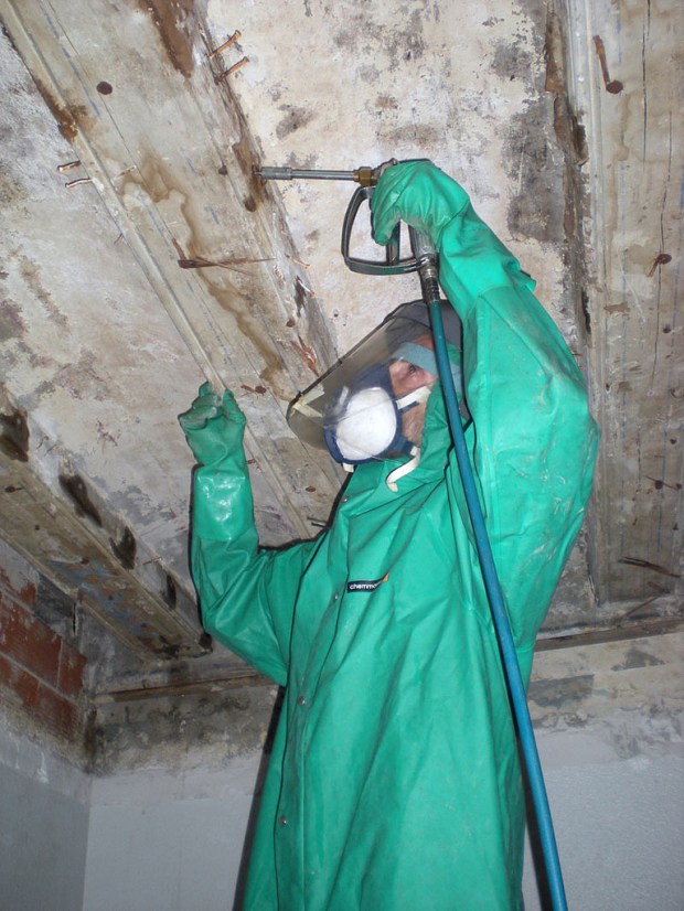 Las vigas estaban a 2’5 metros del suelo. Había que perforarlas, ponerles válvulas a tresbolillo e inyectar. Lo más duro de todo este tratamiento fue a la hora de inyectar. Uno se tiene que poner un traje impermeable y las protecciones adecuadas. Los movimientos son más lentos, te cae líquido encima y sudas. Sí, sudas mucho y el sudor se queda dentro del traje y te va empapando. Todo este tratamiento mi compañero y yo subidos a una escalera. Lo malo de estos tratamientos es que vas a contra reloj. Siempre surgen contratiempos que te hacen pensar que no vas a cumplir con los plazos.