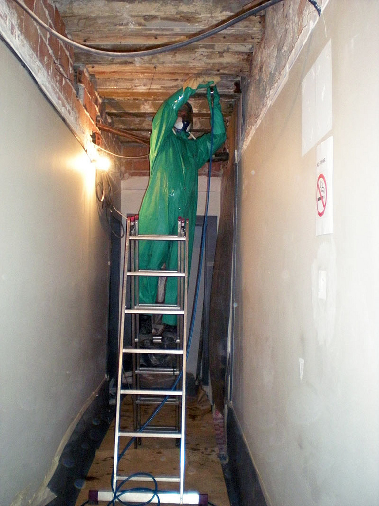 Las vigas estaban a 2’5 metros del suelo. Había que perforarlas, ponerles válvulas a tresbolillo e inyectar. Lo más duro de todo este tratamiento fue a la hora de inyectar. Uno se tiene que poner un traje impermeable y las protecciones adecuadas. Los movimientos son más lentos, te cae líquido encima y sudas. Sí, sudas mucho y el sudor se queda dentro del traje y te va empapando. Todo este tratamiento mi compañero y yo subidos a una escalera. Lo malo de estos tratamientos es que vas a contra reloj. Siempre surgen contratiempos que te hacen pensar que no vas a cumplir con los plazos.