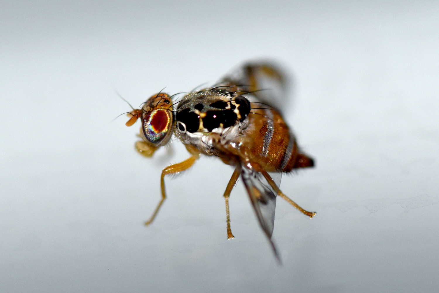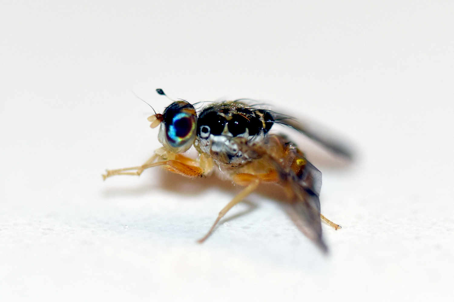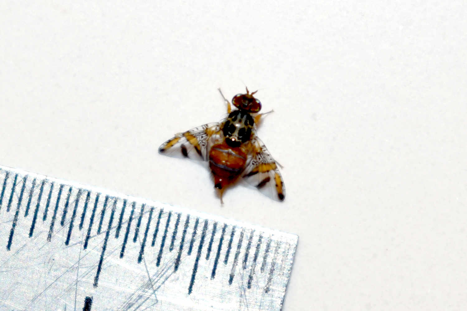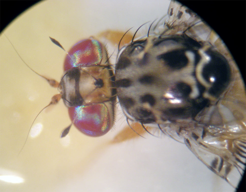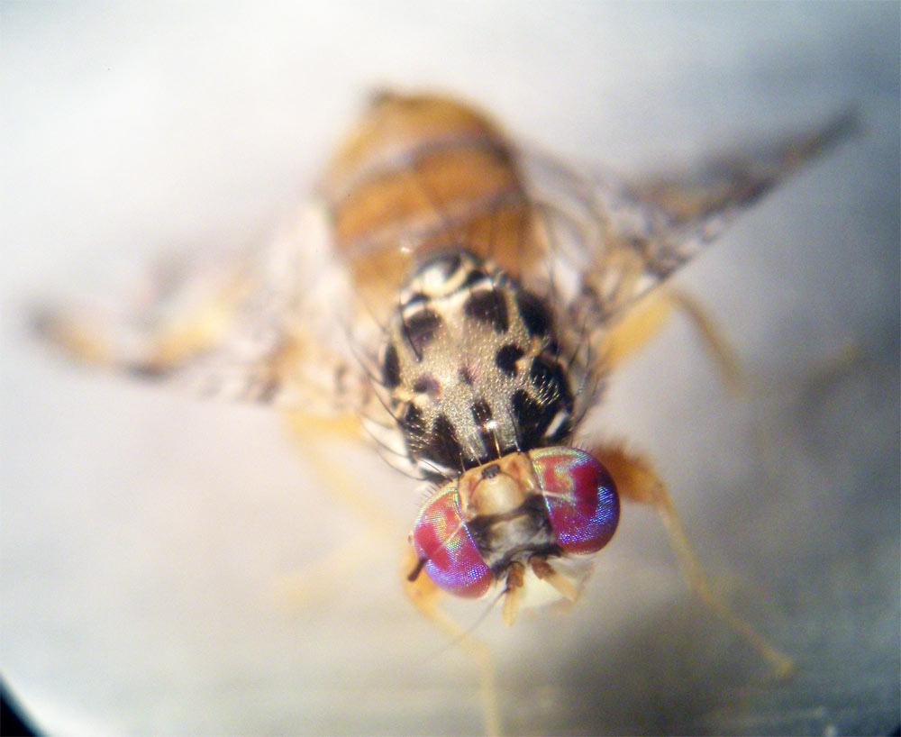 Al ver tantas pupas me picó la curiosidad por saber de qué especie se trataba. Así que recolecté unas cuantas para llevar a casa. Al cabo de una semana vi que las moscas empezaban a salir de su estado de pupa. Vi que eran unas moscas muy bonitas (figura 1). No me eran extrañas. Me parecía haberlas visto antes. Se las llevé a mi compañero Josep Bellavista quien es el entomólogo de la empresa en la que trabajo. Me comentó que eran moscas de la familia Tephritidae, familia comúnmente conocida como moscas de la fruta. Luego concretamos y vimos que se trataba de Ceratitis capitata, llamada comúnmente mosca mediterránea de la fruta. Se trata de una importante plaga de la fruta madurada. Existen otras moscas de esta familia que son plagas como Bactrocera oleae (o mosca del olivo) y Rhagoletis cerasi (o mosca de la cereza) [1].