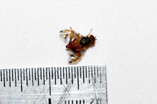 En casa tomé unas fotografías a través de la lupa binocular y me quedé maravillado (figuras 5 a 7). ¡Qué mosca tan bonita! Toda ella es una preciosidad: los ojos púrpuras, el tórax con manchas negras y el abdomen a franjas alternas blancas y amarilla. Pero lo más bonito es que no tiene unas con dibujos de rayas negras y bandas amarillas. El adulto mide unos 7 milímetros de longitud (figuras 7 y 8). Su aspecto es inconfundible y es única en su género Ceratitis. En las imágenes 5 a 7 se puede ver un macho. En muchas algunas familias de moscas, ambos géneros se diferencian claramente por la posición y tamaño de los ojos. Las hembras suelen tenerlos separados y los machos juntos y de mayor tamaño. En el caso de C. capitata, el macho carece de oviscapto géneros y tiene dos antenas más en la parte superior de la cabeza que finalizan en un engrosamiento.
