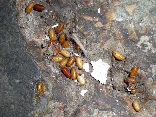 Prueba de ello es que en un rincón de la despensa encontré el suelo lleno de pupas de mosca. Había centenares. Me pareció importante y se lo comenté al jefe de cocina. Me dijo que habían tenido en esa zona unas cajas con membrillos durante 15 días. Las habían retirado unas horas antes de que yo llegara. Me cuesta imaginar que dejaran estropear fruta, pero lo cierto es que disponen de un huerto y les sobra materia prima. En las imágenes 1 y 2 se pueden ver pupas de mosca entre las grietas de un viejo suelo de cemento. Había pupas ya maduras y también algunas larvas a punto de pupar.