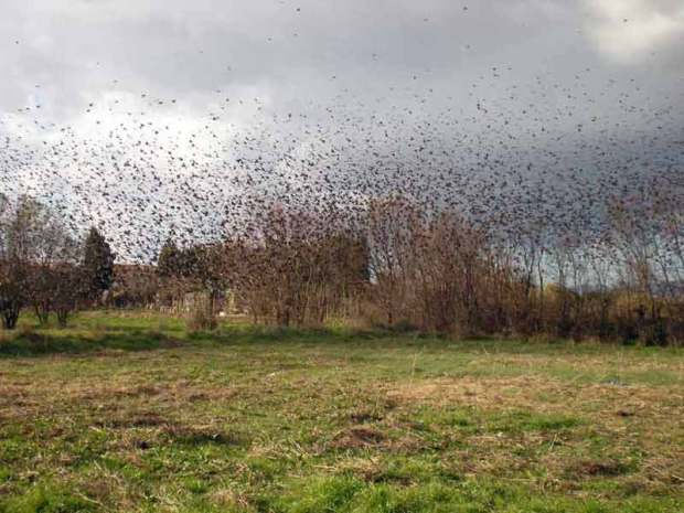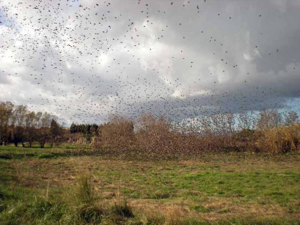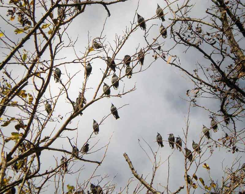 Estas vistosas bandadas que se congregan a principios de otoño, están formadas por el estornino pinto (Sturnus vulgaris). Se concentran en gran cantidad al tener un comportamiento gregario fuera de la época de reproducción. Son un problema en los pueblos y ciudades que escogen para pasar la noche. Se concentran en una zona donde hay árboles. En estos dormideros lo dejan todo sucio de excrementos. Pero también son una molestia durante el día en zonas que escogen como comederos al encontrarse cerca de recursos alimenticios como olivos.