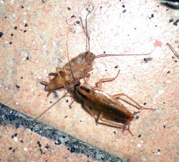 Fig 1. Una cucaracha germánica comiendo los líquidos internos de otra. Los puntitos negros que hay sobre el suelo son las deposiciones de las cucarachas./ C. Pradera 12-2012