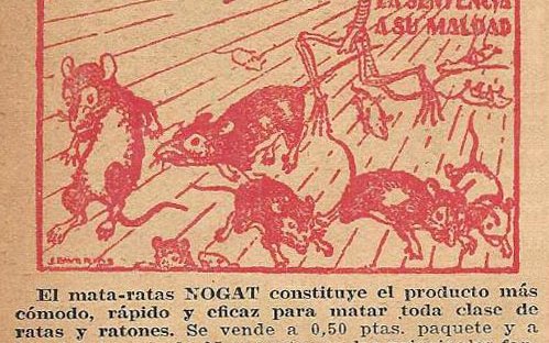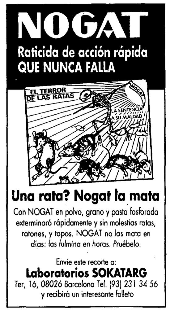 Si buscamos en los periódicos, es a partir de 1926 que aparecen anuncios. Para la publicidad, se crearon dos ilustraciones y eslóganes que daban cuenta de su eficacia. En la imagen número 1, se pueden ver estas ilustraciones en una publicación de 1955 que explica la vida y costumbres de las ratas. En la ilustración de la izquierda aparece un gato rodeado de ratas que están contentas y no le tienen miedo. El lema es: «Gato harto no caza». Y en el cuadro de la derecha, la muerte en forma de esqueleto persigue a las ratas que huyen. El lema es: «El terror de las ratas. La sentencia a su maldad». Pues bien, la segunda ilustración fue la más utilizada en anuncios y devino con el tiempo en la imagen reconocible de la marca, tal y como hoy se utilizan los logotipos.