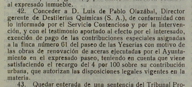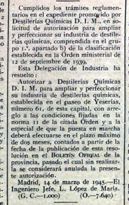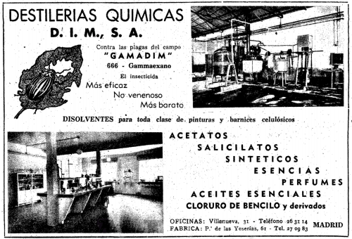 Un caso interesante es el de la empresa Destilerías Químicas DIM SA de Madrid. Tengo poca información. En el libro ‘Industria y comercio de los pesticidas’ de 1963 aparece como productor de HCH (figura 11) [4]. Aparece con el cargo de director gerente Luis de Pablo Olazábal (figura 16). Parece que fue fundada a principios de la década de 1940. Tenía las oficinas en la calle Villanueva, 31. Y la fábrica estaba en el paseo de las Yeserías, 61. La marca Destilerías Químicas fue solicitada el 10 de marzo de 1945 y un mes después fue concedida con el número N0019763. Esta empresa solicitó en noviembre de 1946 la patente de un procedimiento para la síntesis del HCH bajo el nombre ‘Perfeccionamientos introducidos en la fabricación de hexacloruro de benceno’ (ES-0175916).