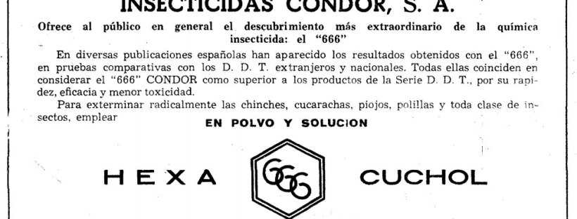 Y para acabar, está el caso de la empresa Cruz Verde SA de Barcelona. Se trata de una importante empresa que fabricó productos tanto para uso doméstico como agrícola. Sobre la producción de lindano, hay poca información. En la edición de La Vanguardia del viernes 17 de julio de 1953, fue publicado un anuncio a toda página sobre el gran logro de Cruz Verde de conseguir un lindano purísimo (figura 12). Desconozco hasta cuándo fabricaron el isómero gamma del HCH. Sería cuestión de ver en qué año sus productos dejaron de llevarlo. Según consta en el anuncio, Cruz Verde también afirma que fue la primera «firma española que fabricó el DDT». Se citan los siguientes productos insecticidas: FULMINANTE, PAPEL HUMO para uso doméstico y VERDANE y FITOSÁN para el campo.