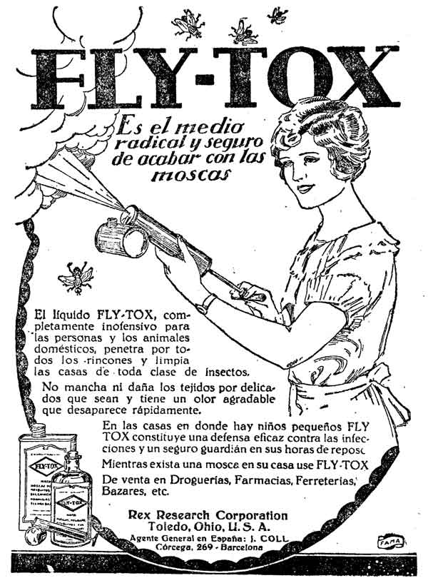 Registraron el nombre comercial de Fly-Tox y en junio de 1922 The Toledo Rex Spray Company empezó su producción. El producto tuvo una buena acogida por el público y tuvo un rápido. En 1924 empezó su comercialización en Europa y Australia. Para la expansión internacional fue creada Rex Research Corporation en Toldeo. Fly-Tox fue pensado para el mercado doméstico. Su uso principal era contra moscas, pero también se podía usar contra otros insectos molestos como cucarachas, chinches, hormigas y polillas. El anuncio más antiguo que he encontrado de su comercialización en España es del 8 de agosto de 1925 publicado en el periódico La Vanguardia (figura 3). El producto se presenta como totalmente inocuo. Se dice que no mancha, no envenena y no es inflamable. Punto importante este último porque al destapar el frasco el usuario notaba el olor a petróleo. Se remarca también que el color de la etiqueta es azul. Dato importante para que no se confundieran y compraran Flit, que tenía como color corporativo el amarillo.