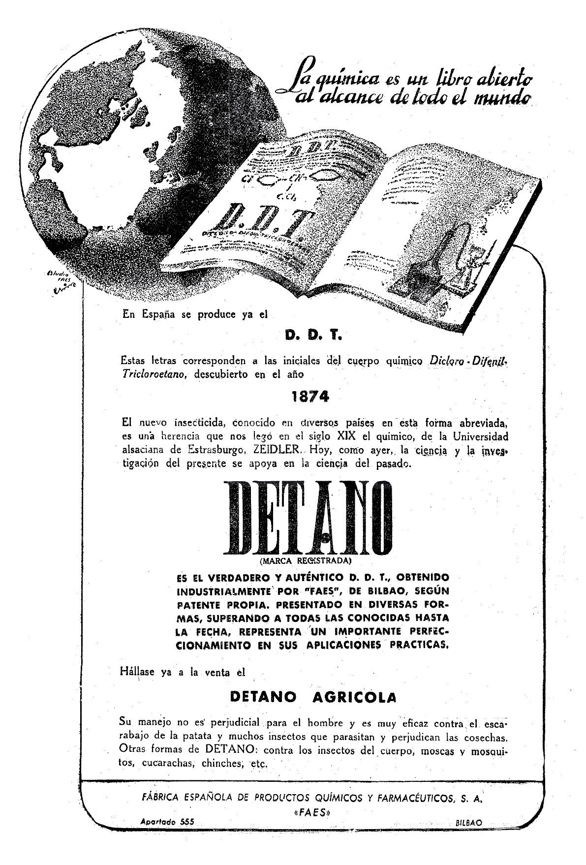La compañía Fábrica Española de Productos Químicos y Farmacéuticos SA (FAES) fue fundada en 1933 en Bilbao. Se trata de una química de Bilbao que desarrolló procesos propios para fabricar DDT que dieron lugar a patentes propias. Empezó a fabricar DDT en noviembre de 1944. Sus instalaciones iniciales tenían una producción anual de 12.000 kilos de DDT. En 1946 ampliaron las instalaciones. Los insecticidas a base de DDT producidos por FAES fueron comercializados bajo la marca DETANO. Como se deduce, este nombre refiere de alguna manera al del DDT. A mediados de 1945 aparece publicado en el periódico ABC un anuncio sobre el DETANO AGRÍCOLA donde se explica que se fabrica DDT bajo patente propia (figura 15). Este producto era contenía DDT al 20%. Hubo otros productos con este nombre comercial como DETANO MATACHINCHES, DETANO MATAPOLILLAS, DETANO MATACUCARACHAS, etc. No sé hasta cuándo FAES estuvo produciendo DDT. En 1957 fue publicada en el BOE una solicitad de ampliación de las instalaciones de DDT para pasar de producir 60 toneladas anuales a 400 (figura 18). Produjo también otros insecticidas, así como anticriptogámicos, herbicidas y raticidas. Hoy en día esta empresa sigue en activo y es una importante empresa farmacéutica.