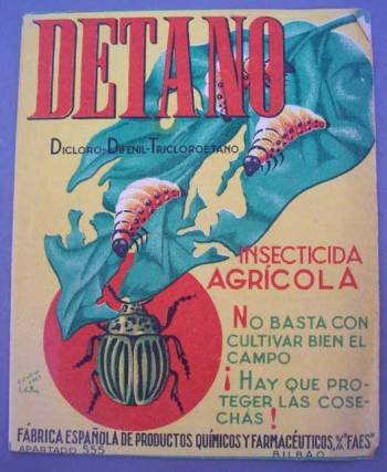 En una entrada anterior dediqué unas líneas históricas sobre el compuesto insecticida dicloro-difenil-tricloroetano, más conocido por las iniciales DDT [1]. En esta entrada me gustaría escribir sobre la producción de este ingrediente activo técnico en España por diversas compañías químicas. A la producción nacional hay que sumar su importación. Entre 1945 y 1960 fue ampliamente utilizado contra todo tipo de insectos, incluso fue utilizado contra ratas y ratones mediante espolvoreo en las madrigueras. Fueron muchos los productos insecticidas comercializados.
