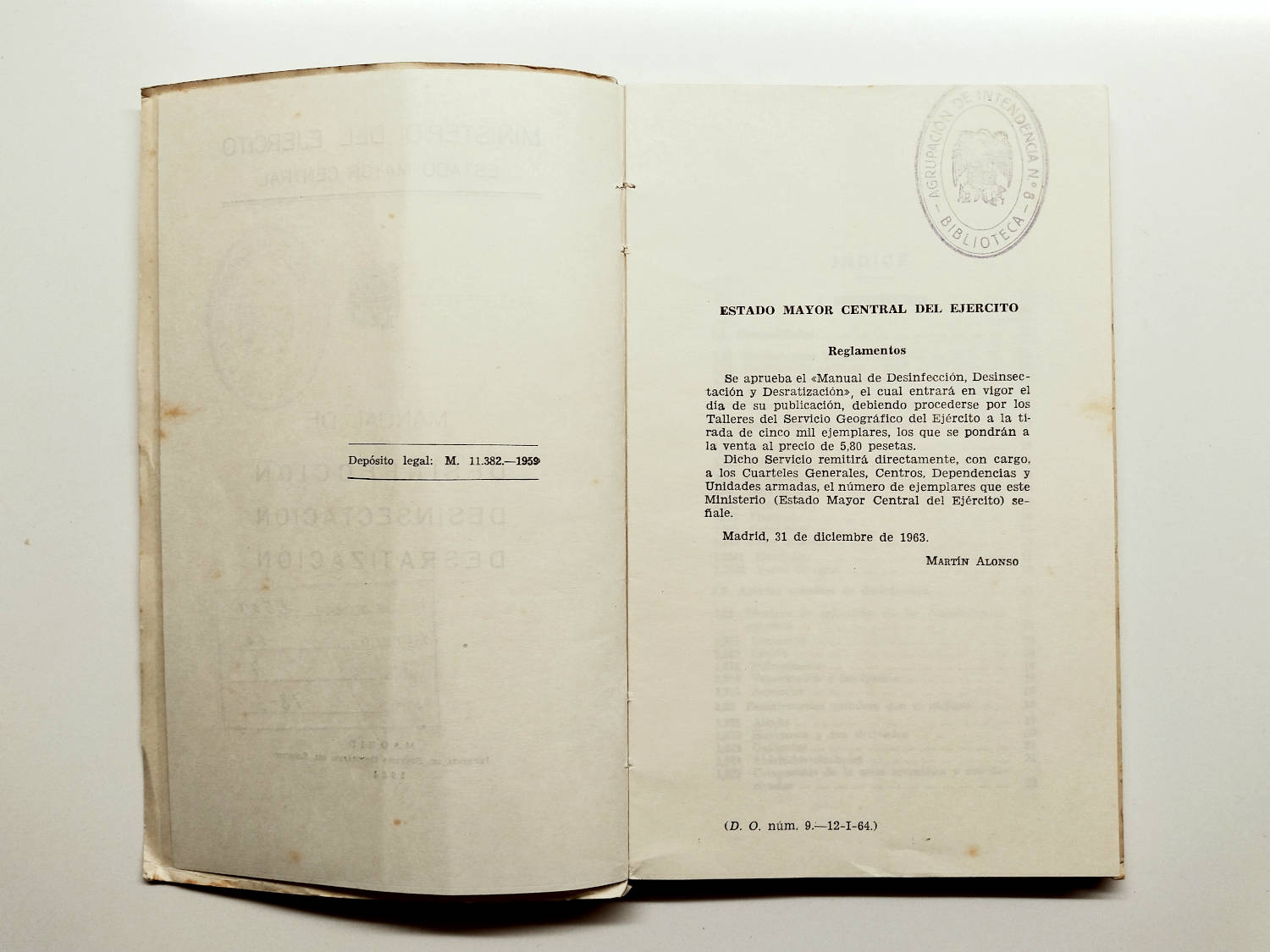 – Estado Mayor Central del Ejército. 1964. Manual de Desinfección, Desinsectación y Desratización. Ministerio del Ejército, Madrid. Imprenta del Servicio Geográfico del Ejército. 135 páginas. 12’5 x 20’5 mm. Depósito Legal M. 11.382-1959.