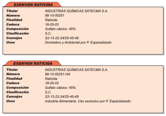 Este uso del yeso como raticida fue más allá de la práctica particular. A finales de la década de 1990 hubo un producto raticida llamado Exenven registrado como plaguicida por la DGSP con el número 98-10-00251 para uso ambiental y 98-10-00251HA para uso en industria alimentaria (figura 2). El titular del producto era Industrias Químicas Satecma SA de Madrid. Tenía registro tanto para uso doméstico como para industria alimentaria. Se presentaba en bolsitas de 45-50 gramos con un contenido del 45% de sulfato cálcico anhidro. En los panfletos publicitarios se podía leer esto: