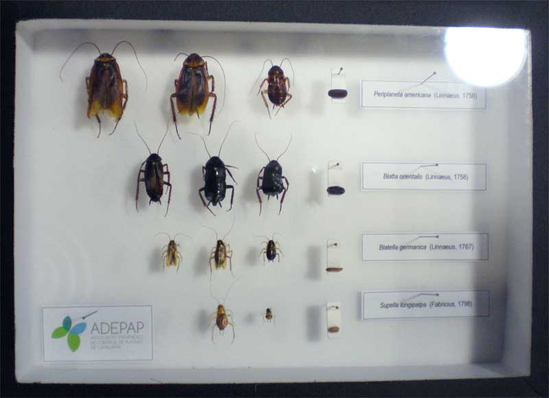 Para finalizar ha hablado sobre la biología de la cucaracha de banda marrón todo un sabio. Se trata de Xavier Bellés, director del Instituto de Biología Evolutiva (CSIC-UPF). Todo lo que ha dicho ha sido interesante y me ha sabido a poco. Lo que daría por poder escucharle largo rato. Al finalizar hemos podido acercarnos a la mesa para ver un pequeño insectario donde estaba la Supella longipalapa junto con las cucarachas más habituales con que podemos encontrarnos en Barcelona. Hay que decir que la cucaracha de banda marrón está instalándose en la ciudad [2]. De momento, es un hecho incipiente cuyo alcance veremos en los próximos años.