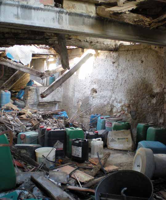Este pasado fin de semana estuve por las tierras del Ebro a su paso por la provincia de Tarragona. Se trata de una zona que me gusta mucho. Estuve en Móra d’Ebre. Con mi mujer paseamos río abajo para ver el paisaje y disfrutar de estas tierras tan bonitas. Al regresar por un camino diferente, nos encontramos una casa abandonada (fotografía número 1). No me lo pensé dos veces y me acerqué para ver si se podía entrar. Me gusta mucho la arquitectura y la vida rural. Tenía ganas de ver en qué año fue abandonada la casa e imaginar qué tipo de vida llevaban. Hay multitud de aspectos que me despiertan la curiosidad. Siempre encuentras algún objeto que no conoces. Había que entrar con cuidado, ya que las vigas estaban muy carcomidas y, en algunos puntos, el techo había cedido. Al entrar, lo primero que me llamó la atención fue una habitación con garrafas (fotografía número 2). Tenían diferentes colores, por lo que deduje que se trataba de garrafas de insecticidas. Estuve mirando y pude ver algunas de insecticidas, acaricidas y herbicidas. En las etiquetas se podían leer estos nombres: Albelda A. M. (aceite de verano al 83%) de Albelda, Gusafos 20 EC (metil azinfós al 20%) de Porporas, Insecticida Oro Amarillo 5 (aceite de invierno al 55%) de Químicas Oro, Narval (amitraz al 20%) de Afrasa, Supracid 40 WP (metidation al 40%) de Novartis, Roundup (gifosato al 36%) de Monsanto.