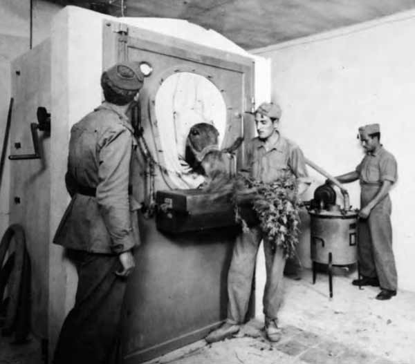 Fig 3. Soldados de veterinaria militar del realizando una desparasitación en cámara fija con un sulfurador modelo Clayton en 1943.