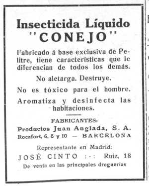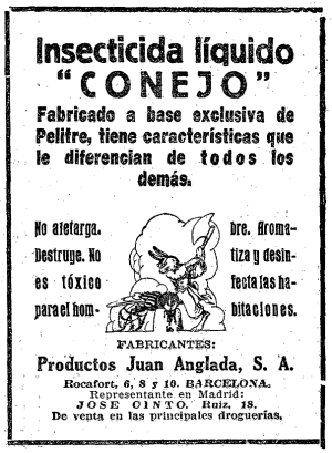 Juan Anglada Boguñá fue un empresario barcelonés que se dedicó a fabricar productos de perfumería y estética. En la década de 1920 debió de empezar a comercializar insecticidas bajo la marca Insecticida Conejo. Buscando en hemerotecas, encuentro los primeros anuncios en 1929 (figuras 2 y 3). Esto no significa que empezara entonces el lanzamiento comercial de esta marca, sino que seguramente debía estar ya establecida y era una cuestión de mayor publicidad y prestigio. De hecho, parece que este producto gozó de un cierto éxito de ventas. Juan Anglada estaba establecido en la calle Rocafort núms. 6-8-10 de Barcelona.
