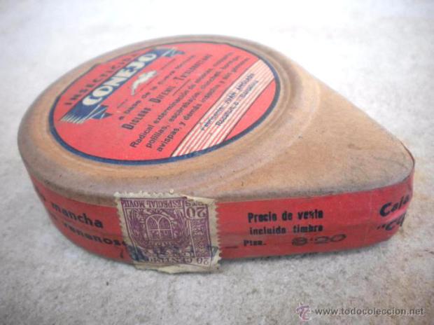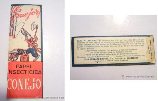 A partir de mediados de la década de 1940, fue enriquecida la fórmula del Insecticida Conejo con la adición del organoclorado DDT (figuras 7 y 8). Como ya he comentado en otras entradas al tratar otras marcas insecticidas, esto fue una tendencia general. Con ello, además de conseguir el efecto derribo del pelitre se conseguía un efecto duradero del DDT. En esta época los formulados básicos de Juan Anglada seguían siendo el polvo para espolvoreo y el líquido para pulverizar. De esta época he encontrado también papel fumígeno con lindano, materia activa muy persistente y letal (figura 9).