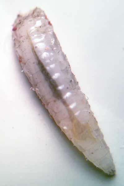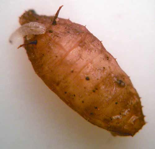La mosca jorobada está bien adaptada a interiores. Tanto la puedes encontrar criando en tubos de drenaje de aguas residuales como en un trocito de materia orgánica perdido en una esquina de una cocina. Las fotografías de esta entrada son de una muestra que recogí el jueves pasado de debajo de una fregadero donde se lavan ollas y cazuelas. Vi una tapa de olla caída sobre el suelo que llevaba tiempo allí. La levanté y allí había mosca jorobada en todos sus estadios reproduciéndose sobre detritos.