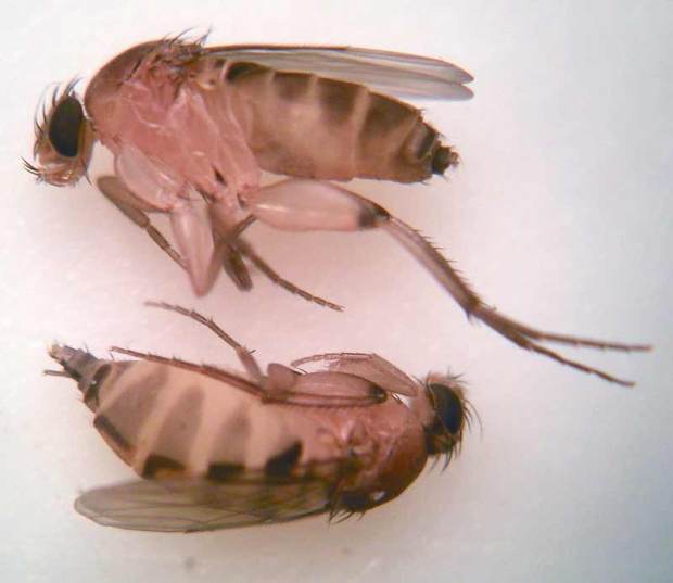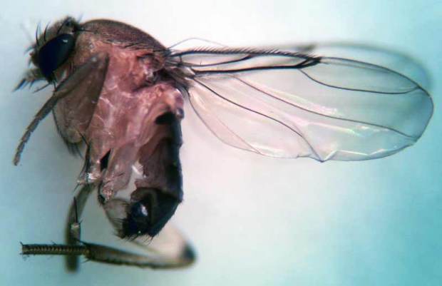 Sobre la familia Phoridae, no he encontrado mucha literatura sobre control de plagas que la citara. La que aparece como común en interiores es Megaselia scalaris, denominada coloquialmente como mosca jorobada. Esta especie tiene una distribución mundial. Sin embargo, es difícil determinar si tenemos justo esta especie en interiores de locales en la zona donde trabajo. Pero lo que sí tengo claro es que la mosca que encuentro es del género Megaselia (figura 1).