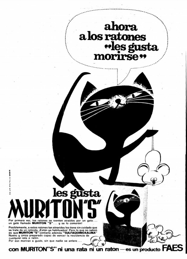 FAES también produjo el raticida MURITON (figura 4), aunque no sé en qué año debió de ser comercializado. Es posible que a finales de la década de 1950. Posteriormente, hacia 1964 este producto pasó a llamarse MURITON S (figura 7). La letra ese fue añadida porque la nueva fórmula contenía sulfaquinoxalina. Este compuesto de la familia de las sulfamidas tenía como fin eliminar las bacterias que desde el intestino aportaban vitamina K a ratas y ratones. Estas bacterias hicieron más resistentes los múridos a los nuevos compuestos anticoagulantes cumarínicos que se usaron intensivamente a partir de principios de la década de 1950. Igual que desconozco cuándo fue comercializado este producto raticida, tampoco sé cuándo dejó de ser fabricado. El cumarínico de este raticida era 3-(alfa-acetonilbencil)-4-hidroxicumarina, es decir, warfarina.
