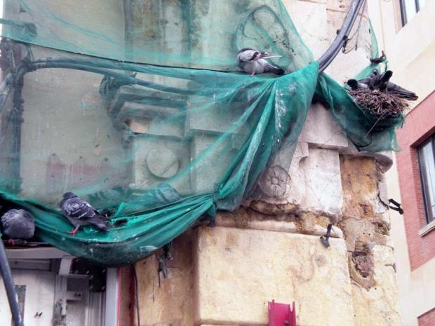Fig 2. Las palomas aprovechan hasta las bolsas que forman las mallas de protección para instalar su nido./ C. Pradera 05-2013