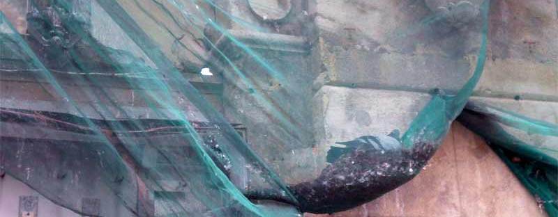 Fig 2. Las palomas aprovechan hasta las bolsas que forman las mallas de protección para instalar su nido./ C. Pradera 05-2013