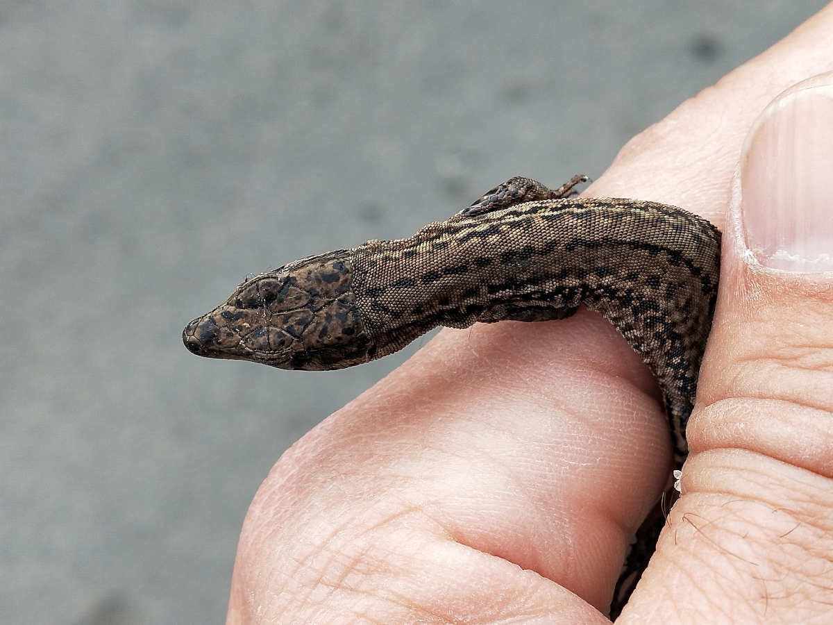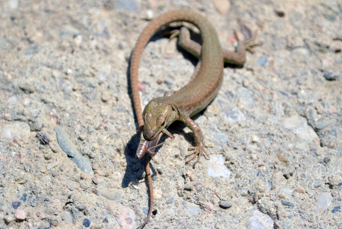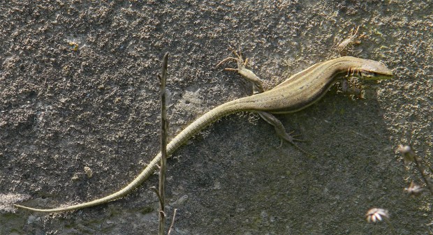Un ejemplar adulto de lagartija parda puede llegar a medir unos 14 centímetros de longitud. Tiene el cuerpo aplanado y la cabeza triangular. El dorso es de color pardo con tonos verdes. Y tiene una línea vertebral negra y fragmentada que va de cabeza a cola. Esta coloración la ayuda a esconderse. Los tonos verdes del dorso me recuerdan al color de los líquenes que crecen sobre piedras y paredes. Sin embargo, existe gran variabilidad de un ejemplar a otro. Las fotos de esta entrada corresponden todas a ejemplares diferentes encontrados en Santa Coloma de Gramenet. La primera imagen es de una pared en la avenida de la Pallaresa. Las imágenes 3 y 4 fueron tomadas en la ribera del río Besós. También las imágenes 5 y 6 fueron tomadas en la misma zona. Pertenecen a un ejemplar cazado por un niño. Y en las cuatro últimas se puede ver cómo un adulto traga un saltamontes (figuras 7 a 10). Como se puede ver, hacer una descripción del aspecto no es fácil, ya que entre cada individuo hay variabilidad. Pero si la comparamos con Podarcis muralis, la lagartija roquera, que se encuentra también en Cataluña, observaremos un patrón más sencillo y una coloración más apagada.