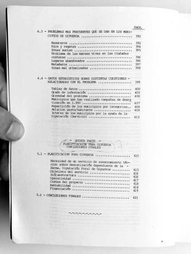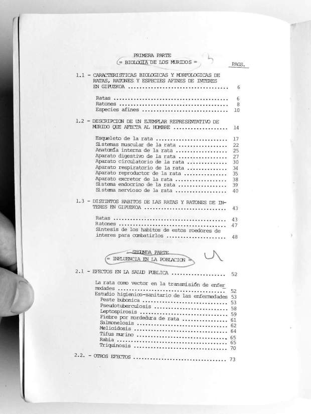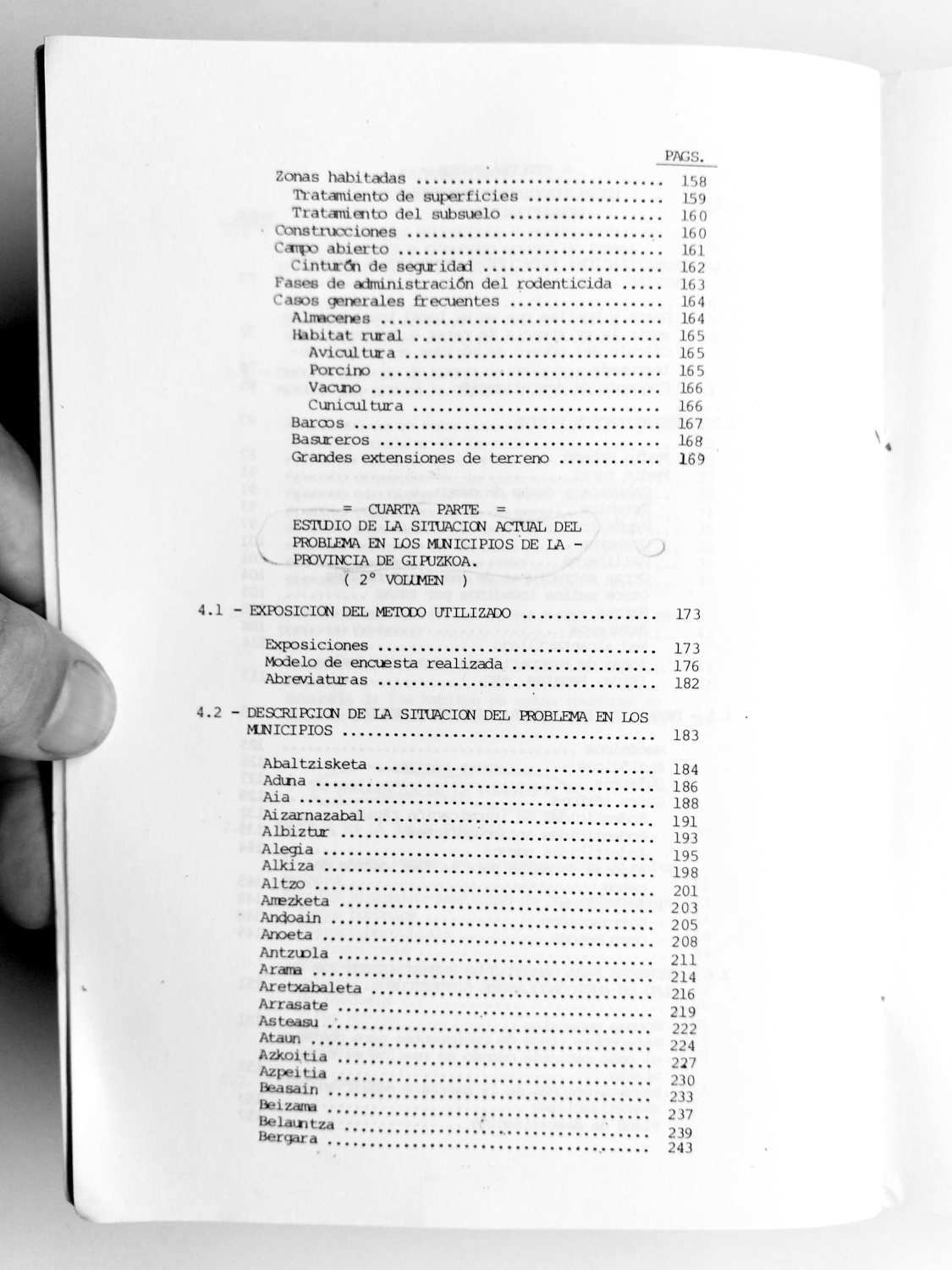 Encontré ‘Los múridos y el hombre’ de Rafael Vert y Juan José Martínez de 1982 a la venta. No pude evitar comprarlo. Es un estudio técnico y exhaustivo sobre el problema de las ratas en la provincia de Guipúzcoa. Fue escrito para orientar al personal administrativo responsable de la desratización de los municipios de esta provincia. En su momento fue un estudio pionero sobre desratización. Nada igual se había escrito en España. Aunque su lectura no solo fue de utilidad para este personal de administración, sino para los profesionales del control de plagas. Y las conclusiones de sus autores, los cuales vierten su experiencia, era aplicable para cualquier población.