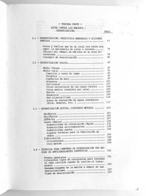 En sus 425 páginas, se desgrana todo lo necesario para efectuar con éxito la desratización de un municipio (figuras 2-6). Está dividido en 4 apartados, aunque más bien se puede dividir en dos bloques. El primero es de tipo teórico. Se describen las especies de roedores sinantrópicos, así como su influencia en la salud pública. También se explican los medios activos y pasivos para controlar a estos animales, así como las técnicas y materiales para realizar un plan de desratización. Este bloque es sumamente interesante para saber los medios con que se contaba en el año 1982. A mí me ha sido de utilidad para completar aspectos que desconocía.